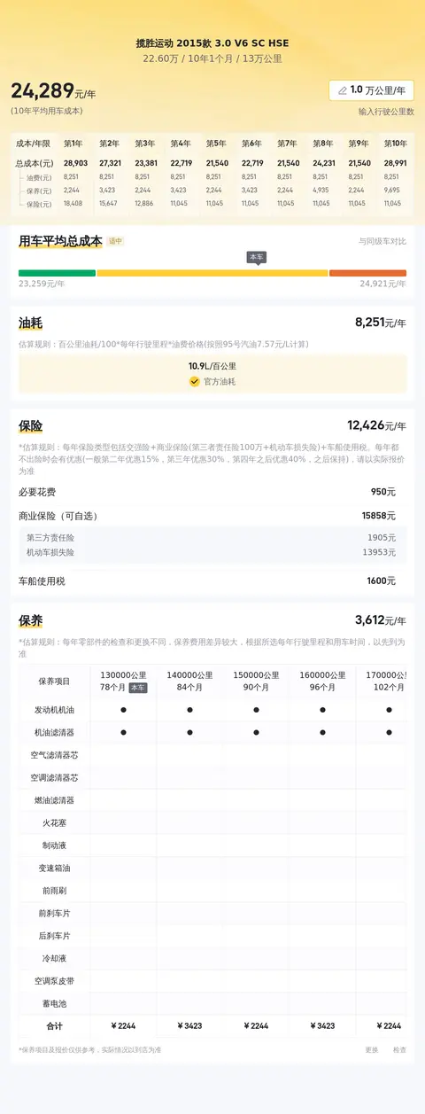 在购买二手车时,除了考虑购车成本外,还需要合理预期日常使用中的开支。根据相关数据估算,2015款揽胜运动版3.0 V6 SC HSE的年均综合用车成本大约为23644元。这一估算基于多个因素,包括行驶里程、油耗水平、保险费用、保养维护成本以及配件价格等。实际用车成本可能会因个人驾驶习惯、车辆维护状况和地区差异等因素而有所波动。因此,在购买前,建议潜在买家根据自己的实际情况和预期使用强度,对用车成本进行个性化的评估和规划,以确保能够持续负担车辆的日常运行和维护费用。