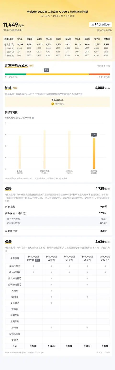 在购买二手车时,除了购车费用外,我们还需要考虑日常使用的成本。根据懂车帝的数据分析,这款车的10年平均用车成本大约在11578元/年,这一成本在同级别车型中处于适中的水平。这个成本包括了油费、保险费以及保养费等日常用车所需的费用。