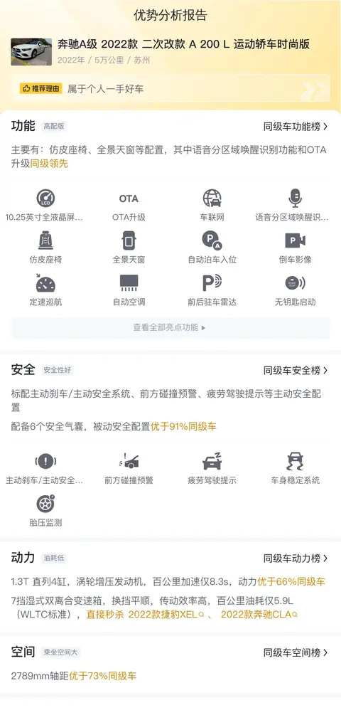 车辆:奔驰A级 2022款 二次改款 A 200 L 运动轿车时尚版
