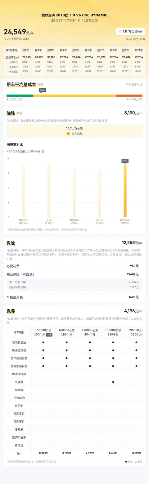 根据大数据预估显示,这款车的市场价格在31.02万至38.29万之间。当然,具体的售价会受到车辆状况等因素的影响。关于用车成本方面,如上图所示,在百公里油耗为10.7L的假设情况下,该车的年平均综合用车成本预计在2.5万元左右。这一估值已考虑了多种成本因素,包括燃油、保险和保养费用等。然而,请注意,实际费用支出可能会因个人驾驶习惯、用车频率和其他不可预测因素而有所变动。