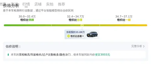 首先我们看下这辆车的市场行情价,我们通过懂车帝大数据分析,综合评估了该二手车未来的趋势,得到其市场行情价应在30.85万-36.21万之间。需要说明的是,市场行情价仅作为您购车的参考,最终的购车价格还是取决于您跟卖家的交易情况而定。
