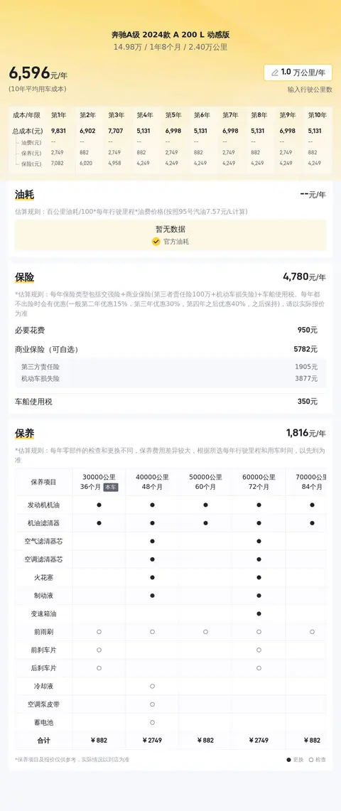 平均每年行驶里程按照1万公里计算,包括保险、日常保养以及燃油费用等,平均用车成本约为每年1.2万元左右。具体费用根据车主的实际使用情况和用车环境等因素会有所差异。