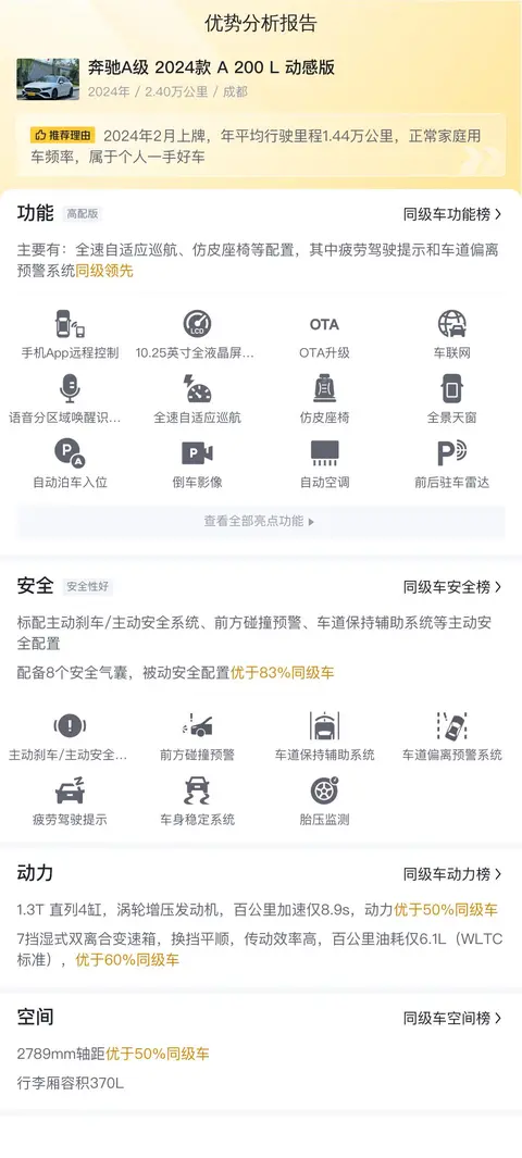 该车具体版本为2024款奔驰A 200 L动感版,上牌地为成都,上牌日期2024年2月,表显里程2.4万公里,白色车身深色内饰,新车指导价26.08万,二手车报价14.98万,过户次数0次。支持分期购车,首付4.49万即可开回家。