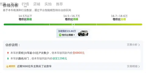 坦克300 2021款 越野版 2.0T 征服者的市场行情价是13.62万- 16.62万,它的报价则是15.60万,报价偏高,不过它最近半年的热度比较高,而且保值率也高,是63.97%,而同级车的平均值是49.81%。