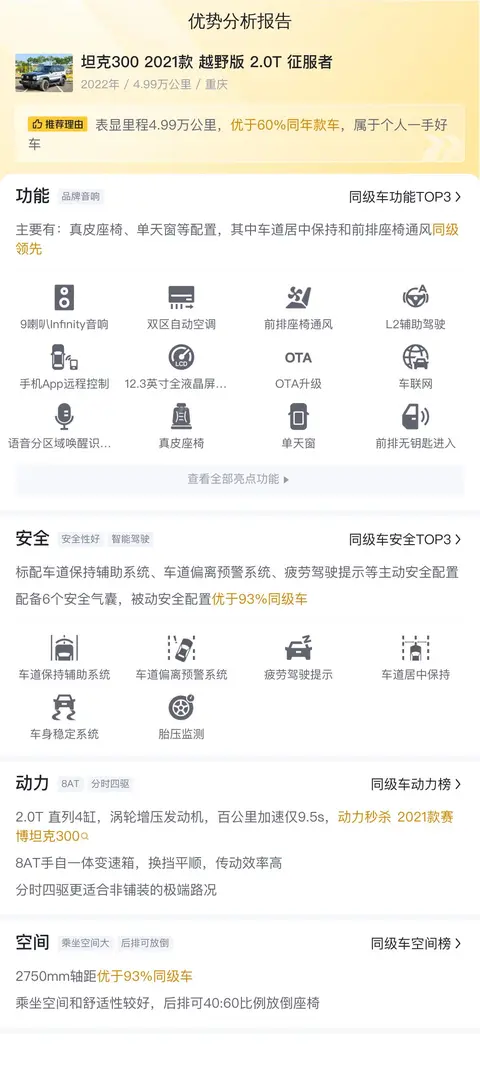 坦克300 2021款 越野版 2.0T 征服者经常跑越野的路线,得益于它2.0T直列4缸,涡轮增压发动机,百公里加速仅9.5s,动力秒杀2021款赛博坦克300,8AT手自一体变速箱,换挡平顺,传动效率高。分时四驱更适合非铺装的极端路况。其中车道居中保持和前排座椅通风同级领先,真皮座椅、单天窗等配置,都能提升乘车的舒适度。2750mm轴距优于93%同级车,乘坐空间和舒适性较好,后排可40:60比例放倒座椅,进一步扩展车内空间。