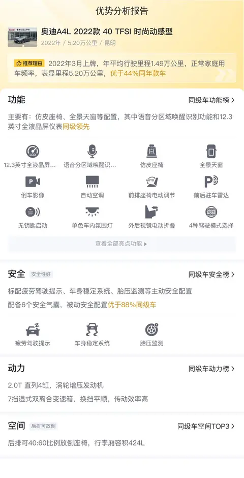 总结:综上所述,对于想要购买二手车的朋友来说,这辆二手奥迪A4L 2022款 40 TFSI 时尚动感型是一个非常不错的选择。它不仅有着出色的性能和舒适的驾乘体验,而且在二手车市场上售价也比较合理。如果您正在寻找一款高品质、高性能的豪华轿车,那么这辆二手奥迪A4L 2022款 40 TFSI 时尚动感型绝对值得您考虑。需要注意的是,以上车况信息需要结合车辆实际情况进行综合参考,希望您在看车过程中一切顺利,早日找到自己中意的好车。