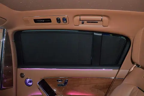 后排中央扶手位置有多个功能按键,包括“一键隐私”和“音盾”功能。按下“一键隐私”就会放下幕布,关闭车窗,升起遮阳帘,后窗遮光,把后排封闭起来。按下“声盾”功能,前排头枕音响就会发出声音干扰,让司机无法听清后排贵宾在说什么。 此外,还有一个指纹锁,可以控制前排扶手箱下方的储物格,起到密码箱的作用。