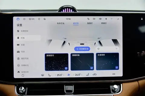 我们这辆四座版本后排顶棚是光导纤维星空顶棚,可以选择三种模式的星空顶显示,还能模拟流星划过。因为顶棚插接有光导纤维,所以尽量不要徒手用力按压,否则可能会损坏光导纤维,而且还有划伤的风险。