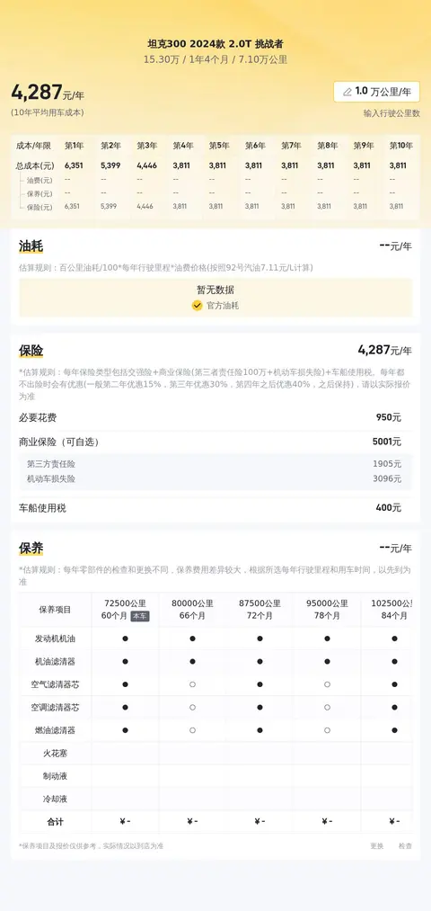 这款坦克300 2024款 2.0T 挑战者首次上牌时间为2024年6月,截至目前,该车行驶里程为7.1万公里,该车车源所在地及上牌地均为兰州,该车新车含税指导价为21.88万,目前二手车报价15.3万元,该车目前尚未进行过户。对于想要购买一辆性能卓越、品质可靠的越野SUV的消费者来说,这辆坦克300是一个不错的选择。