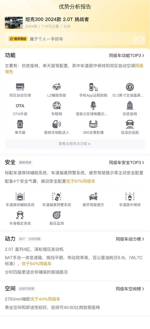 对于想要购买一辆性能卓越、品质可靠的越野SUV的消费者来说,这辆坦克300 2024款 2.0T 挑战者是一个不错的选择。它不仅拥有出色的驾驶体验和舒适的乘坐感受,还具备强劲的动力、高效的燃油经济性以及卓越的越野能力。在车况良好、性价比高的情况下,更值得考虑。