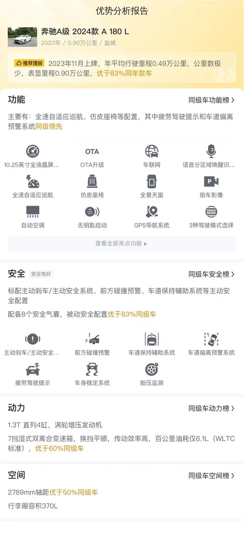 今天为大家带来的这款奔驰A级 2024款 A 180 L,上牌地车源地均为江苏盐城,上牌日期2023年11月,表显里程9千公里,白色车身深色内饰,新车指导价24.95万,二手车报价14.1万,过户次数1次。