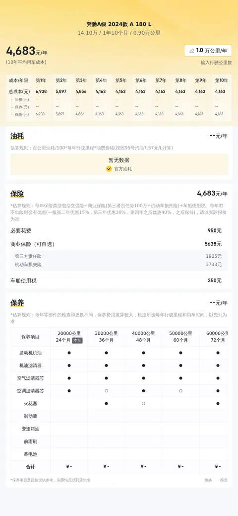 用车成本方面,按一年行驶一万公里计算,该型车每年燃油、保险及保养的综合用车成本约11578元,具体费用要看用车频率及使用环境而定。