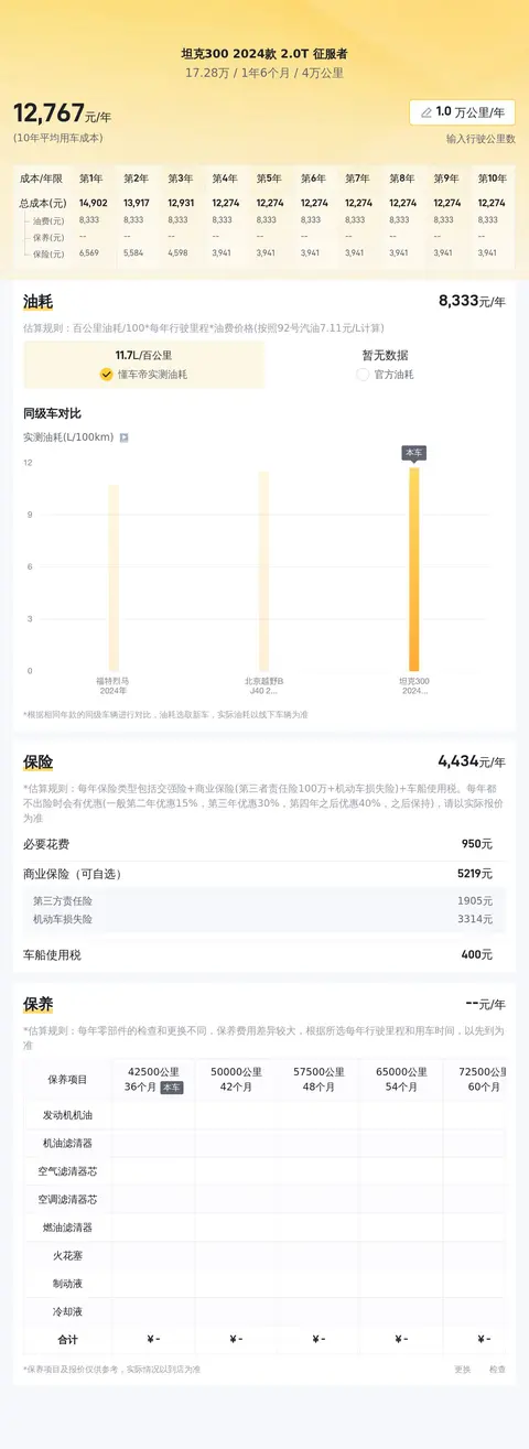 据估算,坦克300 2024款 2.0T 征服者的年均综合用车成本大概是1.3万元左右,但具体金额还需要根据车主的实际使用情况和用车习惯来确定。