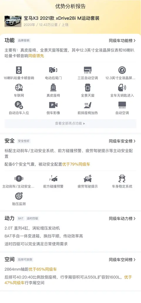 接下来,让我们一起来了解一下这辆二手宝马X3的具体情况。这是一辆2021款宝马X3 xDrive28i M运动套装,上牌地为江西上饶,上牌时间为2020年6月,表显里程12.43万公里,有过1次过户记录,车身颜色为白色,国VI排放标准。新车指导价42.58万,目前二手车报价16.8万。