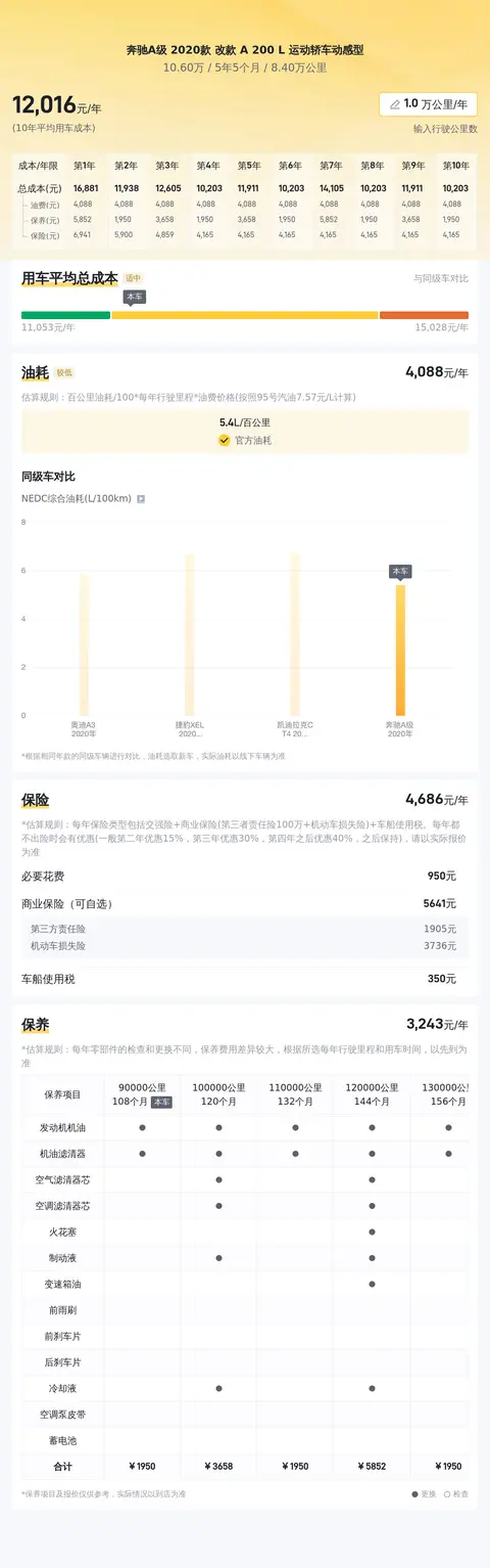 在选择购买一辆汽车时,除了考虑其购买价格外,还需要仔细评估日常使用的成本。今天,我们将聚焦于二手奔驰A级 2020款 改款 A 200 L 运动轿车动感型这款车,从保险费用、保养费用、油耗成本和日常洗车打蜡等其他费用四个方面,全面剖析其用车成本。我们保守估计,这辆车的年均综合用车成本大约在1.2万元左右。具体费用细节如下:1. 保险费用:根据往年数据,机动车交通事故责任强制保险(交强险)费用为950元/年,机动车第三者责任保险(三者险)保费大约为3357元/年,机动车损失保险(车损险)保费约为4630元/年。此外,还包括一些其他的商业保险费用,如盗抢险、玻璃险、划痕险、自燃险、涉水险等,我们暂且估算为1000元/年。为了简化计算,我们这里只考虑交强险、三者险和车损险三个必选项目,因此总的保险费用约为8937元/年。2. 保养费用:根据往年数据,我们估算这辆车的年均保养费用大约为1648元。3. 油耗成本:为了提供一个客观的评估,我们参考了官方发布的油耗数据。根据官方公布的信息,这辆车的百公里油耗为5.4升。按照当前油价计算,我们估算出这辆车的年均油耗成本大约为4768元。4. 其他费用:除了上述三项主要费用外,还有其他一些不可避免的日常开支。例如,您可能需要定期对车辆进行清洗和打蜡,以保持其外观的清洁和光泽;您可能还需要购买一些车载用品,如香水、纸巾盒等,以提升驾驶的舒适性和便利性。这些费用虽然看似微不足道,但如果长期积累下来也可能是一笔不小的数目。根据往年数据,我们估算这一部分的年均费用大约为500元。综上所述,这辆车的年均综合用车成本大约在1.2万元左右。当然,实际费用可能会因个人驾驶习惯、用车频率等因素而有所差异。但无论如何,我们都希望这份用车成本分析能够为您提供有价值的参考,帮助您做出更加明智的购车决策。