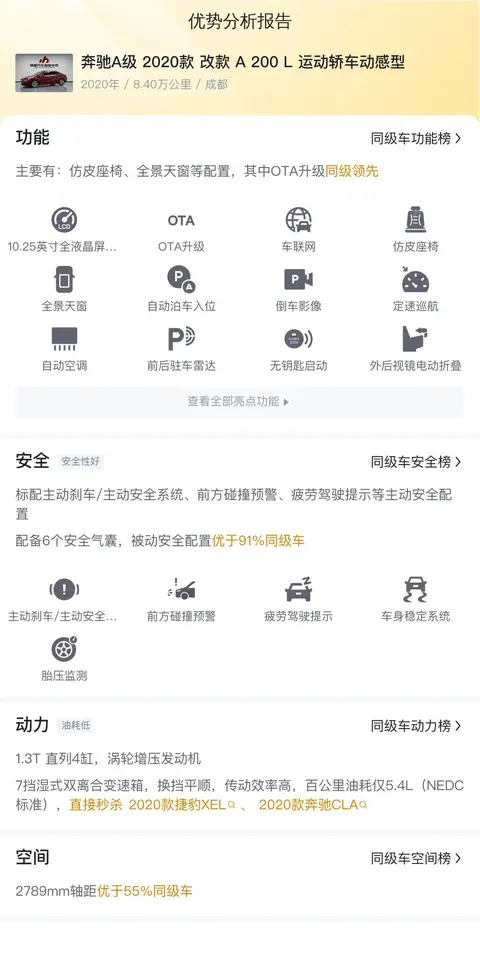 综上所述,奔驰A级 2020款 改款 A 200 L 运动轿车动感型在各个方面都展现出了出色的性能和品质。无论是外观和内饰的设计,还是动力系统和安全配置,都体现了奔驰品牌的豪华与精致。同时,这款车还提供了多种驾驶模式和亮点配置,让驾驶者能够根据自己的需求来进行选择。如果您正在寻找一款豪华紧凑型轿车,那么这款奔驰A级绝对是一个不错的选择。