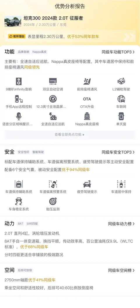 在同级别车型中,坦克300 2024款 2.0T 征服者在配置、动力、空间等方面均表现出色。其搭载的2.0T直列4缸涡轮增压发动机,配合8AT手自一体变速箱,提供了充沛的动力输出。车内宽敞的乘坐空间和丰富的储物格设计,满足了家庭出行的需求。相比之下,其他竞品车型如牧马人、普拉多等,在配置上可能稍显不足;而帕杰罗、兰德酷路泽等车型则在价格上相对较高。综合来看,坦克300 2024款 2.0T 征服者凭借其出色的性价比和全面的性能表现,在竞品对比中占据了一席之地。