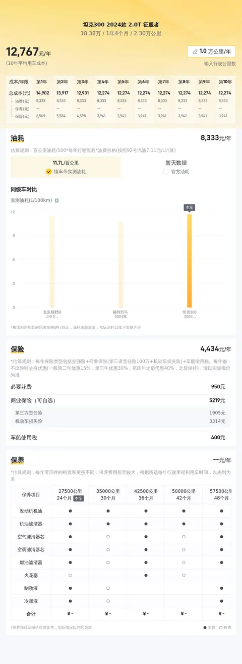 这款坦克300 2024款 2.0T 征服者车型以其卓越的性能、舒适的驾乘体验以及合理的用车成本,成为了众多消费者眼中的理想之选。该款车型在二手车市场上同样表现出色,综合性价比指数高达91%,这无疑为其增添了更多的购买吸引力。选择这款车,您不仅能够享受到它带来的卓越驾驶体验,还能在未来换车时减少经济损失。在用车成本方面,这款车的表现同样出色。基于一年2万公里的行驶里程计算,您的平均用车成本仅为14174元,这一数字相较于62%的同级车型来说,处于较低水平。更低的油耗、保险费用以及保养支出,使得这款车成为了追求经济实惠的车主们的理想之选。综上所述,如果您正在寻找一款性能卓越、性价比高的二手车,那么这款坦克300 2024款 2.0T 征服者无疑是一个值得考虑的选择。