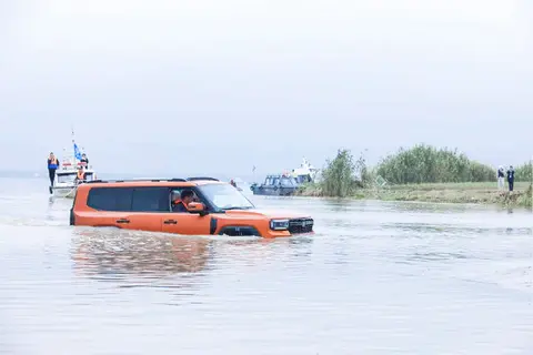 说到涉水,这车前段时间还搞了个狠的 —— 横渡长江!从芜湖黑沙洲渡口出发,22 分钟就过了 1.48 公里宽的江面,当时水位刚好没过轮胎,车门把手还露在外面。长江渡口水流速度超过 5 公里每小时,水下还有暗流,能顺利横渡,全靠它的防水功夫:变速箱、电机、电池这些核心部件都是 IP68 级防水,发动机用了整体正时罩盖,点火线圈、气门室罩盖都有密封或排水设计,甚至还用上了船舶级防锈技术,车厢能承受 2 米深的水压。