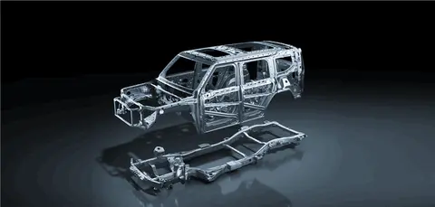 硬派越野核心的就是底盘,这车用的是非承载式车身,带一根 2184mm 的内高压一体式大梁,纵梁 99% 都是高强度钢,走烂路的时候车身不容易变形,稳定性确实靠谱。底盘前后都是双叉臂独立悬挂,这种悬挂在越野时能让车轮更贴地面,抓地力更稳;反观揽胜用的是后多连杆悬挂,更偏向城市驾驶一些。