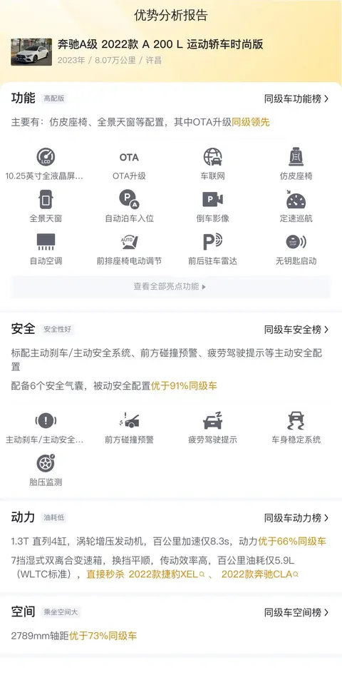 奔驰A级 2022款 A 200 L 运动轿车时尚版拥有众多实用配置,包括仿皮座椅、全景天窗等。特别是其OTA升级功能,同级领先,为驾驶者带来了更加便捷的驾驶体验。在动力方面,该车搭载了1.3T直列4缸涡轮增压发动机,百公里加速仅8.3s,动力表现优越。同时,其7挡湿式双离合变速箱换挡平顺、传动效率高,百公里油耗仅为5.9L(WLTC标准),在同级别车型中具有明显优势。在空间方面,奔驰A级 2022款 A 200 L 运动轿车时尚版的轴距达到了2789mm,优于73%的同级车,为乘客提供了更加宽敞舒适的乘坐空间。