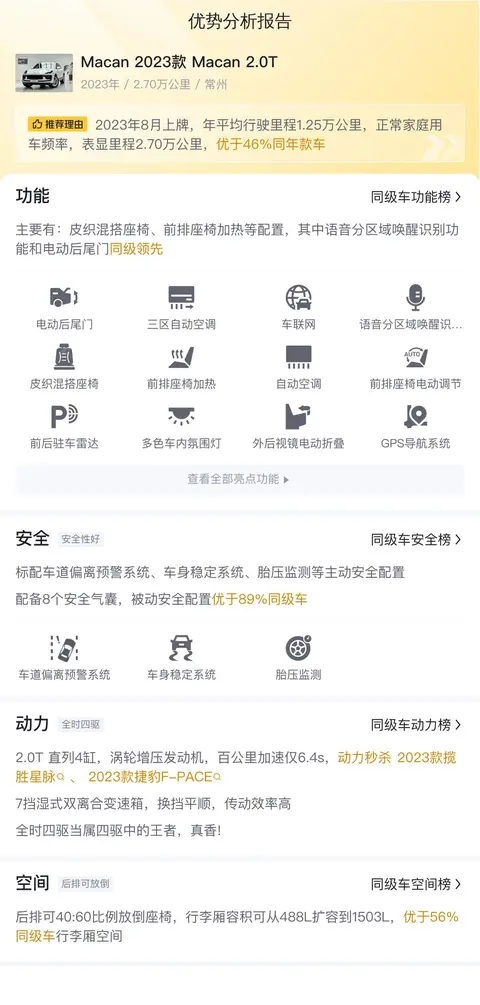 Macan(图片|配置|询价)向来被人们称为“保时捷的价格最低车型”,但“最低价格”并非意味着其他方面也会大打折扣。不论是外观、内饰、动力性能,还是驾乘感受,它都继承了保时捷家族的赛车基因和豪华品质。今天要说的这辆Macan 2023款 Macan 2.0T,上牌一年多,跑了有2.7万公里,二手车报价是39.8万,大家觉得怎么样?