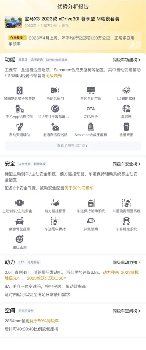 综上所述,宝马X3 2023款 xDrive30i 尊享型 M曜夜套装是一款集豪华、科技与性能于一身的中型SUV。其内饰设计典雅而不失时尚,配置丰富且实用,为驾驶者和乘客带来了极致的舒适体验。动力系统强劲而高效,操控性能出色,让每一次驾驶都成为一种享受。尽管存在一些小瑕疵,但整体而言,这款车是一款值得推荐的豪华中型SUV。如果您正在寻找一款既能提供卓越驾驶体验又能展现非凡品味的车型,那么宝马X3 xDrive30i 尊享型 M曜夜套装无疑是您的理想之选。