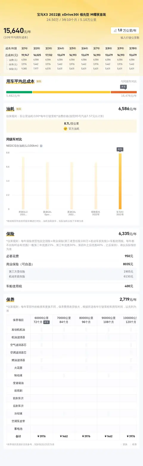 当前市场上,这款宝马X3的二手车价格大约在24.5万至29.75万元之间。关于用车成本方面,我们对保险费用、保养成本、油耗支出进行了大致估算: