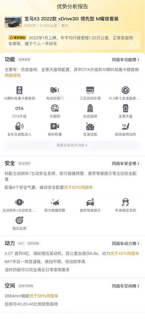综上所述的新车含税价、用车成本、市场行情、优势分析、同款比价等数据仅供参考。在配置部分,因为二手车非标品,车辆可能会存在配置改装的情况,具体车况信息需要线下结合车辆实际情况进行综合参考。