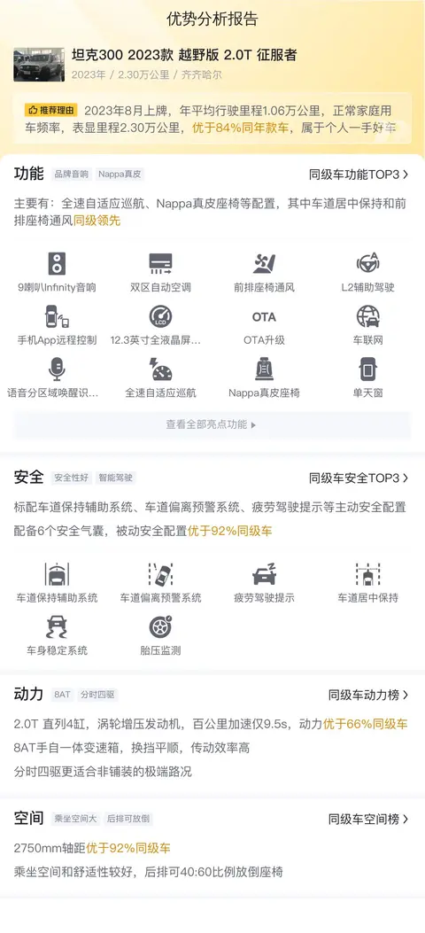 坦克300 2023款 越野版 2.0T 征服者在配置、动力、空间等方面都表现出色,是一款值得推荐的车型。如果您正在寻找一款既能应对日常城市出行又能胜任轻度越野驾驶的SUV,那么坦克300是一个不错的选择。