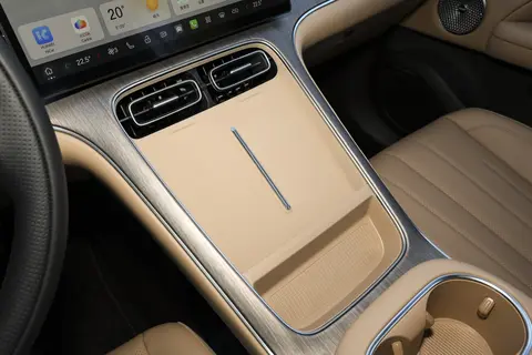 车身侧面的比例非常协调,长宽高分别为4685/1854/1660mm,轴距达到2775mm,接近中型SUV的水准。这种尺寸设计让它拥有了“豪华SUV比例”,车身线条从车头一直延伸到车尾,没有突兀的转折,看起来非常舒展。无腰线设计配合半隐藏式门把手,不仅降低了风阻,还让车身侧面更简洁流畅。D柱区域的线条设计很有层次感,向后抬高的窗线让车身看起来更有动感,同时也保证了后排头部空间。轮毂采用了多辐式设计,造型时尚,搭配起来很协调。