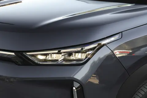 新车的车头没有太多埃安在售车型的痕迹。整个前脸非常简洁。上有贯穿式的灯带搭配了扁平大灯。下进气口则配了较为平直的线条。两侧还有纵向的导流槽。整个前脸看起来干净利落的,还挺大气的。这款车的车头是配了车外投影仪的。去露营的时候,可以在户外放电影。兴致来了,还可以在投个图案在地上回味跳房子的游戏。是不是很好玩?