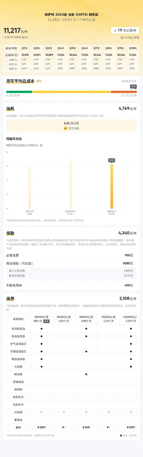 据估算,帕萨特 2023款 改款 330TSI 精英版的平均用车成本是5182元/年,毕竟是油车,这个花费还是可以的。