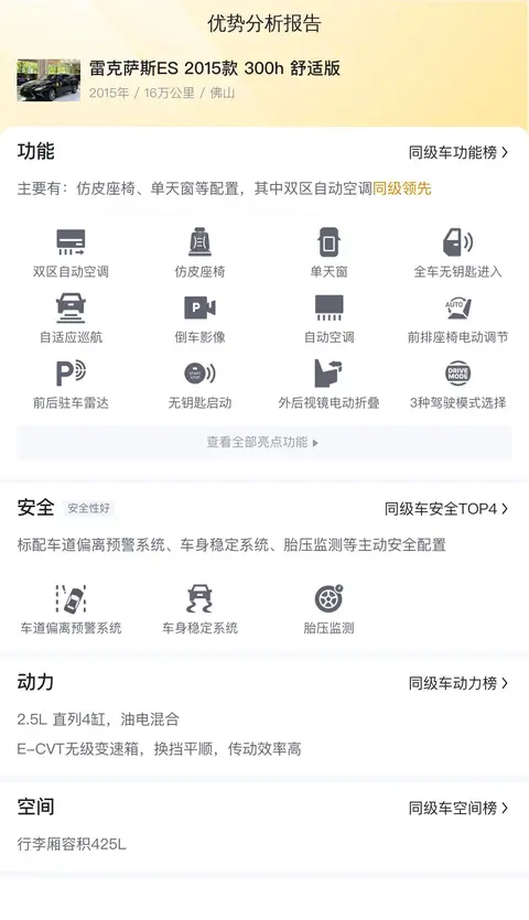 雷克萨斯ES 2015款 300h 舒适版在动力性能、燃油经济性以及配置丰富度等方面都表现出色。作为一款混合动力车型,它不仅具备良好的加速性能和较低的油耗,还为驾驶者和乘客提供了舒适的驾乘体验。同时,车辆的保养费用也相对较低,进一步降低了用车成本。然而,由于车辆已经行驶了16万公里且有过3次过户记录,在购买前还需要仔细检查车辆的车况,确保没有潜在的问题。