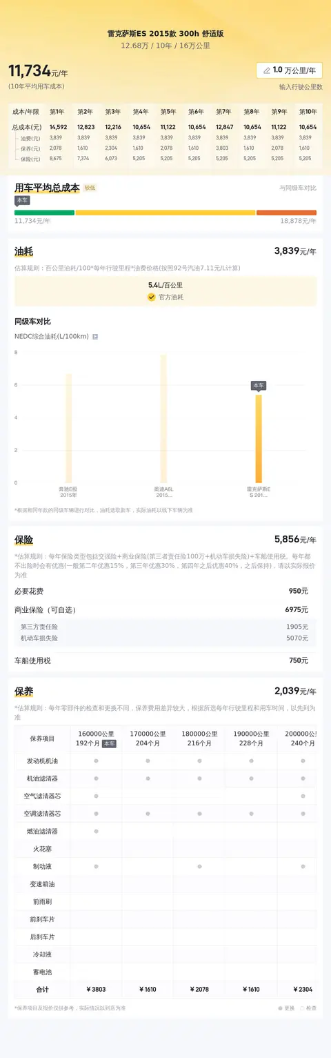 在用车成本方面,雷克萨斯ES 2015款 300h 舒适版的表现也非常出色。除了较低的油耗外,车辆的保养费用也相对较低。根据预估数据,这款车6万公里保养总成本约为5681元,相较于同级别车型来说具有一定的优势。此外,混合动力车型在保值率方面也通常会高于传统燃油车,这也为车主在将来换车时减少了潜在的损失。