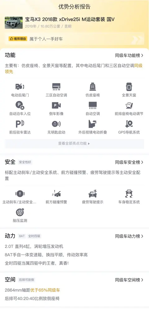该车的优点主要体现在以下几个方面:首先,作为一款豪华品牌的SUV,宝马X3具有较高的品牌知名度和市场认可度,消费者购买意愿较强。其次,该车配备了众多先进的驾驶辅助系统和智能互联功能,如前后部驻车距离报警器、带制动功能的前部碰撞预警、手机无线充电等,提升了驾驶的便捷性和安全性。再次,该车搭载的2.0T发动机和8AT变速箱表现出色,动力充沛且换挡平顺,同时燃油经济性也相对较高。此外,车内空间较为宽敞,尤其是后排座椅可以按一定比例放倒,提升了车辆的装载能力。最后,根据车主反馈和市场评价,该车在外观设计、内饰质感、动力表现等方面都获得了较高的评价。