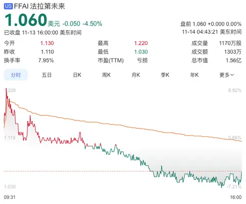 截至美东时间11月13日16点整美股收盘,FF股价报收1.060美元,跌幅4.50%,总市值为1.56亿美元。
