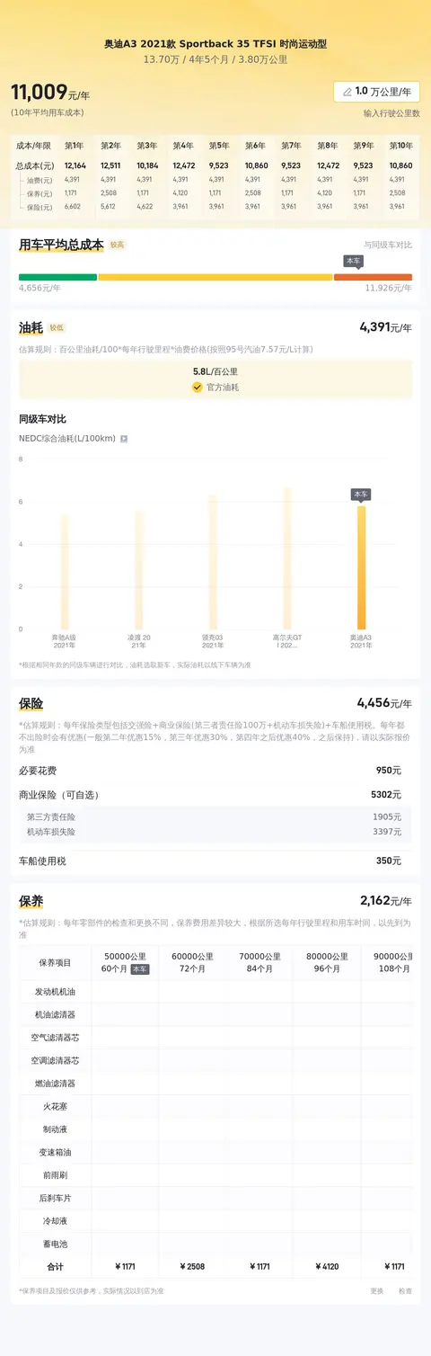 根据懂车帝大数据分析,这辆奥迪A3 2021款 Sportback 35 TFSI 时尚运动型的售价在13.08-15.72万之间,具体售价因车况而有所不同。从市场角度来看,该车属于全国紧凑型车销量榜Top6,证明了其在市场上的受欢迎程度和认可度。关于用车成本方面,该车的官方百公里油耗为5.8L,平均每年保险费用约4296元,保养费用约1688元,这些都在合理范围内。需要注意的是,用车成本可能会根据个人驾驶习惯、用车频率和地区差异等因素有所变动。