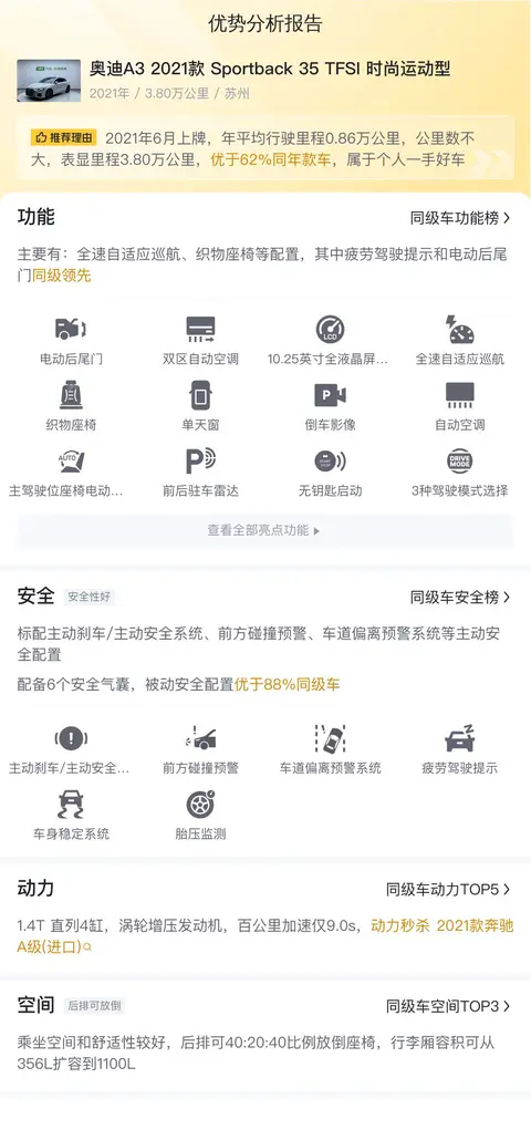 2008年,第一代奥迪A3正式进入中国市场。历经三代的发展,奥迪A3凭借出色的性能和合理的价格赢得了国内消费者的喜爱,市场保有量也相当可观。作为一款豪华紧凑型轿车,奥迪A3在设计、科技以及驾驶动态表现等方面都有着不错的表现。今天要说的奥迪A3 2021款 Sportback 35 TFSI 时尚运动型是一辆2021年6月上牌的白色小轿车,行驶里程3.8万公里,售价13.7万。