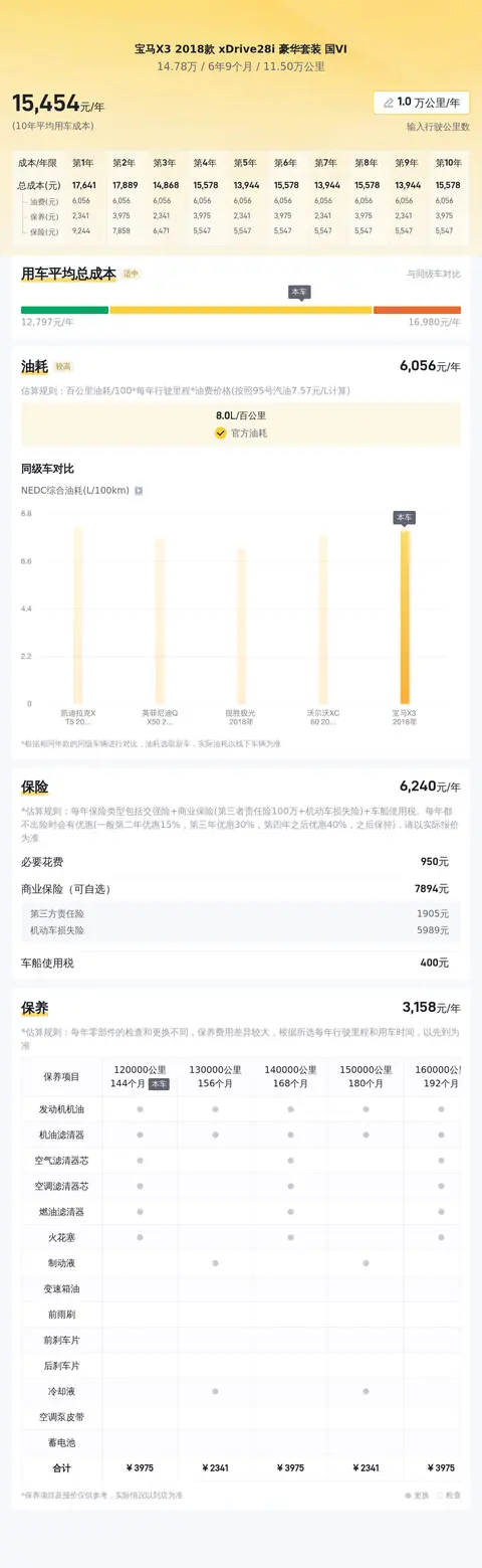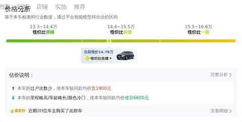 根据大数据预估显示,这辆车的市场价格在15.23万元至18.77万元之间。而该车的报价仅为14.78万元,相较于市场价来说,价格非常优惠。在用车成本方面,该车的平均用车成本为15170元/年。与同级别车型相比,这一成本处于较高水平。不过,由于该车为二手车,其折旧成本相对较低。而且,该车的油耗表现较为优秀,百公里油耗为8升,也能够在一定程度上降低用车成本。