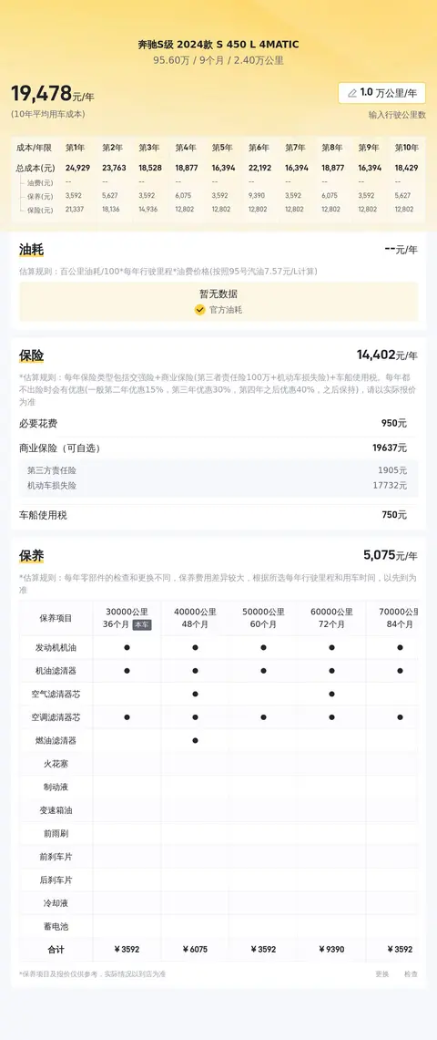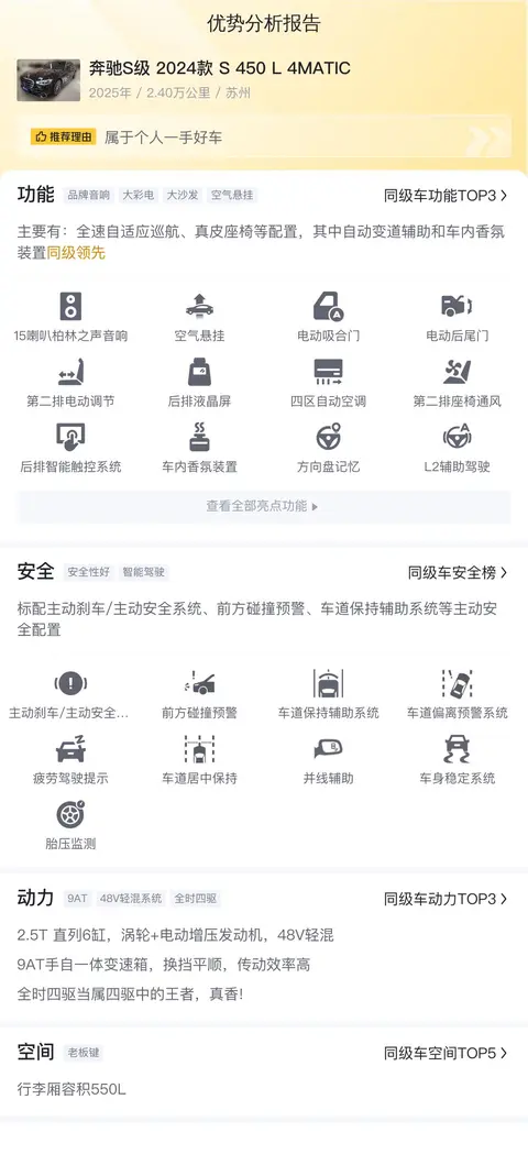 今天咱门要看的这台奔驰S级2024款S450L 4MATIC是2025年1月上牌的,表显里程2.4万公里,车源地和上牌地均为苏州,车身颜色为黑色,新车含税指导价为146.38万,目前二手车报价95.6万,过户次数显示该车辆未曾进行过过户。