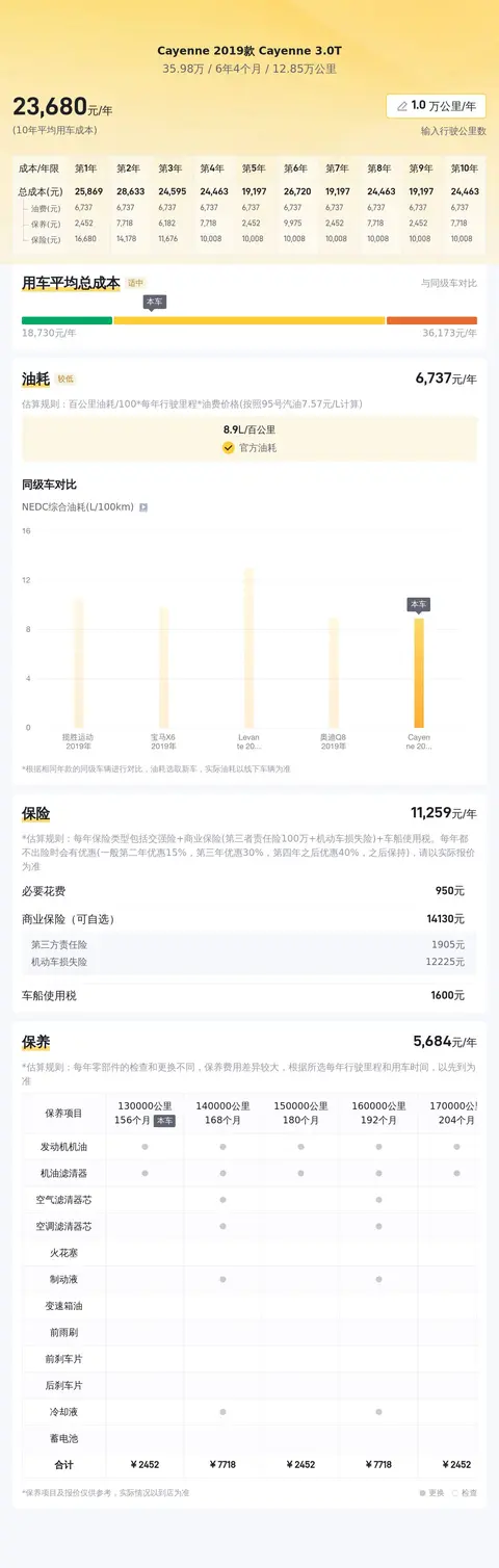 根据大数据预估显示,这辆车的市场价格在35.92万至44.61万之间。当然,具体的售价会受到车辆状况等因素的影响。关于用车成本方面,根据估算,这辆Cayenne的年均综合用车成本约为2.4万元,这一数字在豪华SUV市场中属于相对合理的范畴。需要注意的是,实际费用支出可能会因个人驾驶习惯、地区消费水平等因素而有所变动。