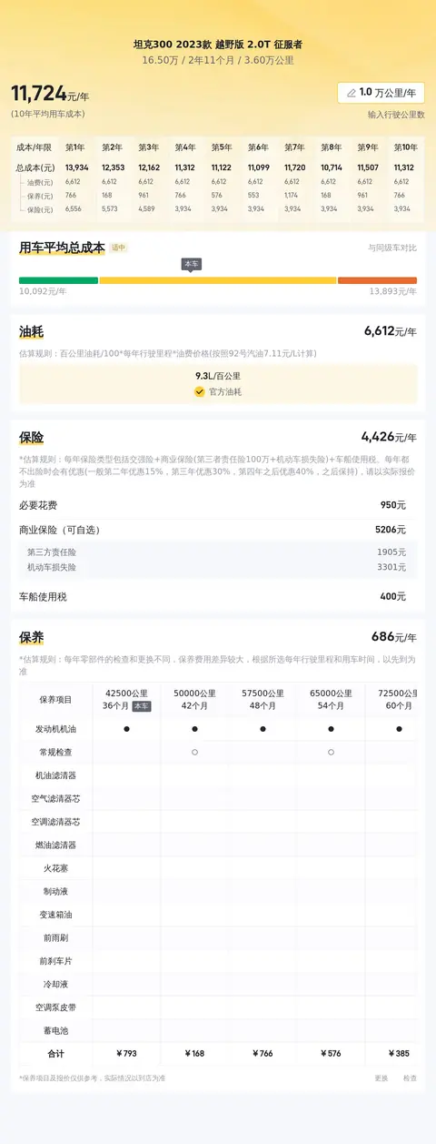 据估算,同级车的最低用车成本是11468元/年,最高是16911元/年,坦克300 2023款 越野版 2.0T 征服者是12568元/年,用车成本适中。
