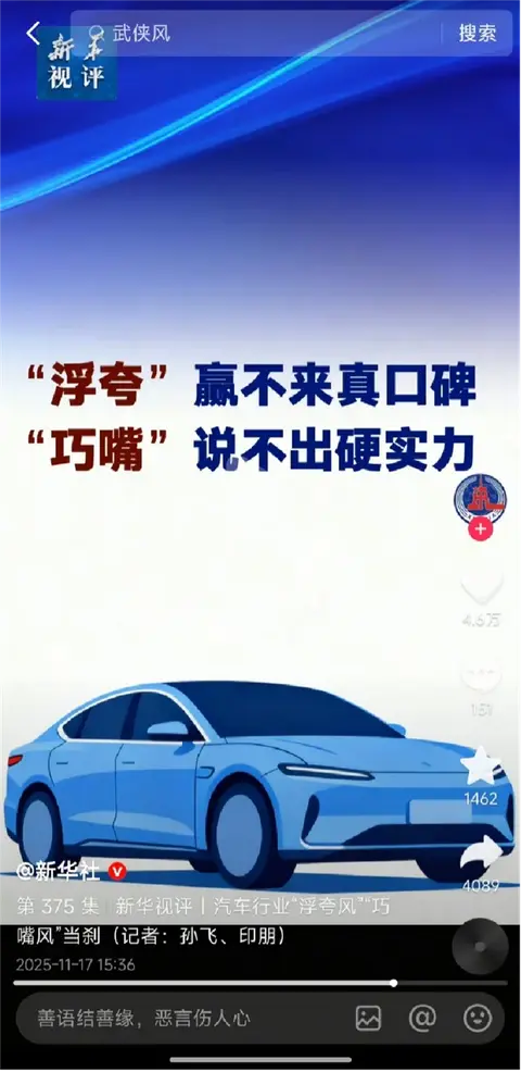 近日,新华社《新华视评》一期锐评引发汽车行业震动,直指当前行业愈演愈烈的“浮夸风”与“巧嘴风”,痛斥各类营销乱象正在侵蚀产业根基。