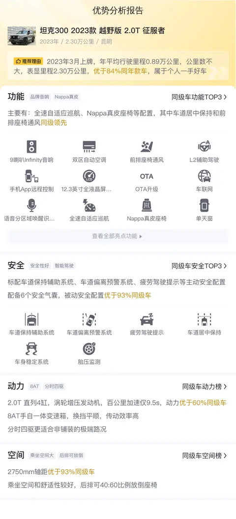 这辆坦克300优势方面,从车况来说,内饰准新,外观看似原厂车漆,这种程度的车况确实很难得,毕竟开车的兄弟们都知道,或多或少都会产生一些日常使用痕迹,其次配置方面,前排座椅通风加热、L2辅助驾驶、360度全景影像、全速自适应巡航、64色车内氛围灯、身份识别、语音分区域唤醒识别、手机无线充电、手机APP远程控制、OTA升级等同级领先配置,同价位很少见如此丰富的电感化配置,暖灯罩着会发光的毛毯,就是对这车配置的最好描述,另外动力方面,这辆坦克300搭载的2.0T直列四缸涡轮增压发动机,最大功率167kw,最大扭矩387n·m,搭配8at手自一体变速箱,动力表现足够优秀,且平顺。