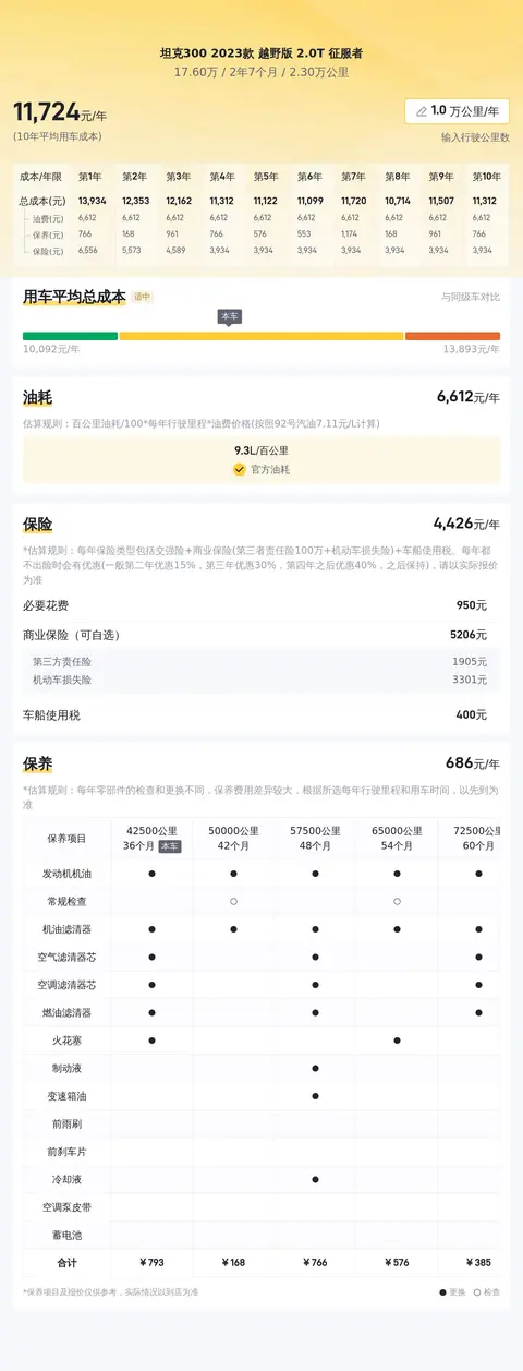 据估算,同级车的最低用车成本是5605元/年,最高是12476元/年,坦克300 2023款 越野版 2.0T 征服者是12476元/年,所以用车成本较高。