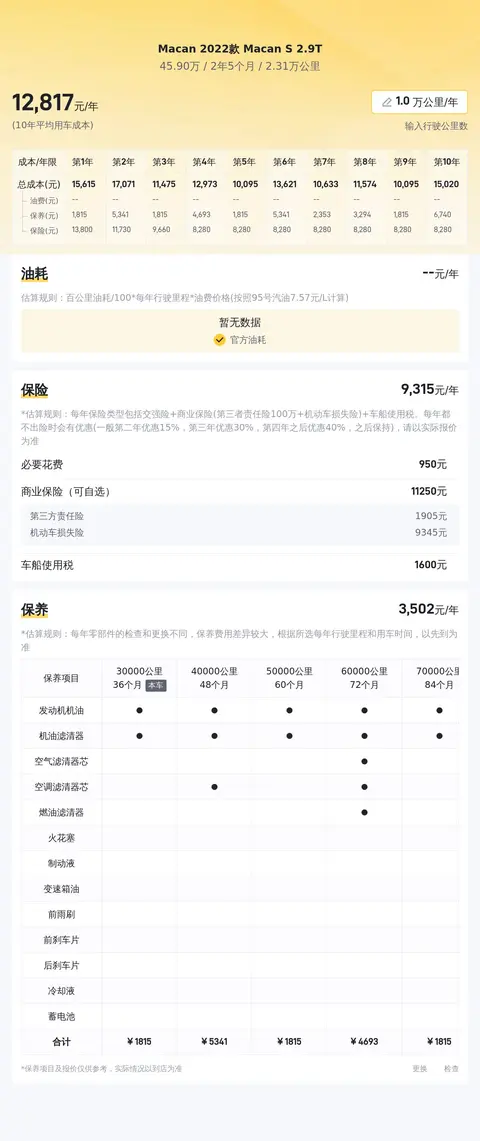 关于Macan的市场行情,我们可以看到在二手车市场上,它的售价区间在39.55万至50.12万之间。而影响最终售价的因素有很多,包括车辆的里程数、车龄、过户次数以及外观和内饰的保养状况等。这些变量都会对车辆的评估价值产生重要影响。