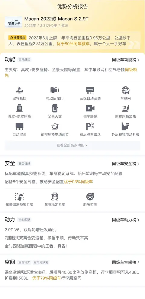 这辆Macan的具体版本是——2022款 Macan S 2.9T,上牌地为郑州,上牌日期2023年6月,表显里程2.31万公里,车身颜色为白色,该车新车指导价68.8万,目前二手车报价45.9万,过户次数0次。