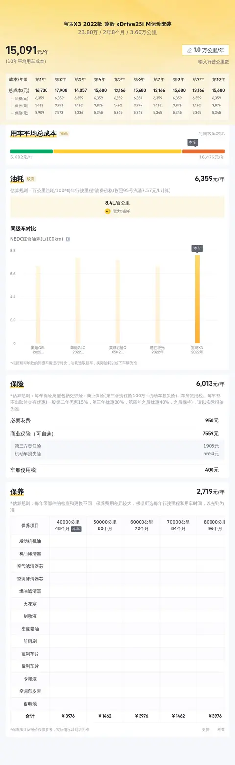 再来看看这款车的使用成本如何,如图所示,根据大数据统计的结果,该车的10年平均使用成本约为15,447元/年。