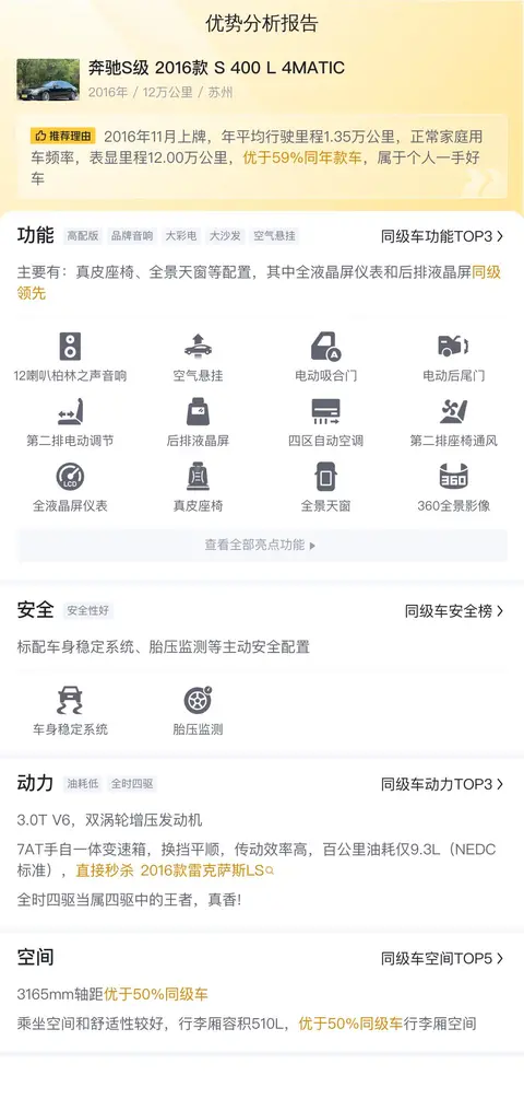 综上所述,这辆奔驰S级2016款S400L 4MATIC的车况表现相当出色。虽然存在一些正常使用造成的磨损和瑕疵,但整体来看,这辆车的车况非常均衡,没有明显的短板。如果您正在寻找一辆性价比高的二手车,那么这辆奔驰S级无疑是一个值得考虑的选择。